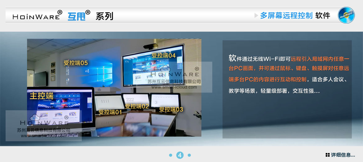 HoinWare®互甩®系列多屏幕触远程控制软件-通过无线Wi-Fi即可远程引入局域网内任意一台PC画面,并可通过鼠标、键盘、触摸屏对任意远端多台PC的内容进行互动和控制,适合多人会议、教学等场景,轻量级部署,交互性强。