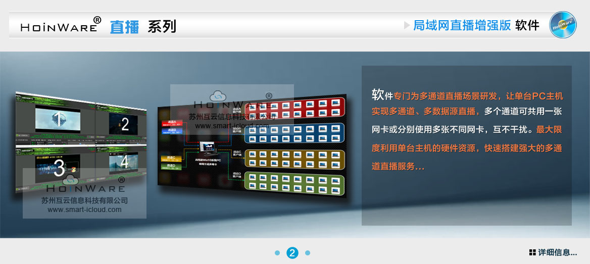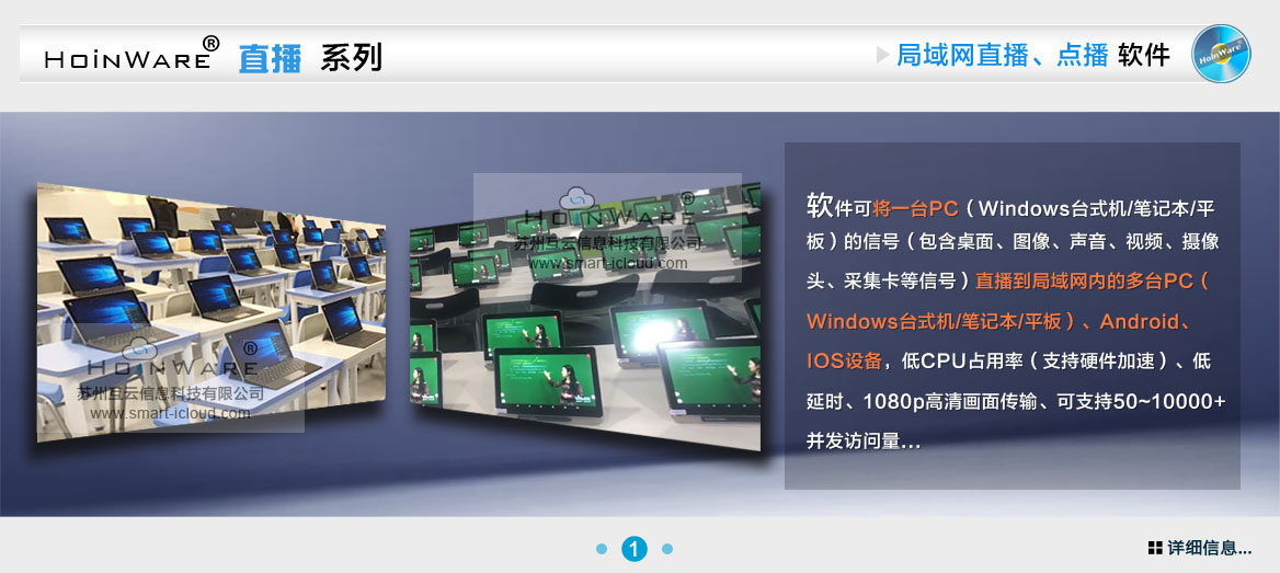 HoinWare®流媒体直播软件可将一台PC(Windows台式机/笔记本/平板)的信号(包含桌面、图像、声音、视频、摄像头、采集卡等信号)直播到局域网内的多台PC(Windows台式机/笔记本/平板)、Android、IOS设备,低CPU占用率(支持硬件加速)、低延时、1080p高清画面传输、可支持50~10000+并发访问量...