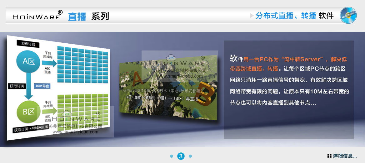 HoinWare®局域网流媒体直播、转播软件软件用一台PC作为“流中转Server”,解决低带宽跨域直播、转播。让每个区域PC节点的跨区网络只消耗一路直播信号的带宽,有效解决跨区域网络带宽有限的问题,让原本只有10M左右带宽的节点也可以将内容直播到其他节点...