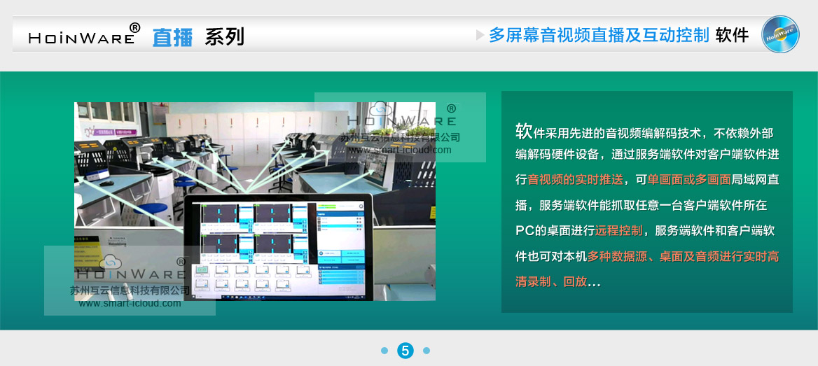 HoinWare®设计研发的“局域网音视频直播及互动控制软件V1.0”提升了局域网内多块屏幕音视频的交互体验。软件采用先进的音视频编解码技术,不依赖外部编解码硬件设备,通过服务端软件对客户端软件进行音视频的实时推送,可单画面或多画面(多个PC画面任意组合)局域网直播,服务端软件能抓取任意一台客户端软件所在PC的桌面进行远程控制(鼠标键盘输入操作),服务端软件和客户端软件也可对本机多种数据源(摄像头、采集卡)、桌面及音频进行实时高清录制、回放,录制过程中可随时截图保存画面。