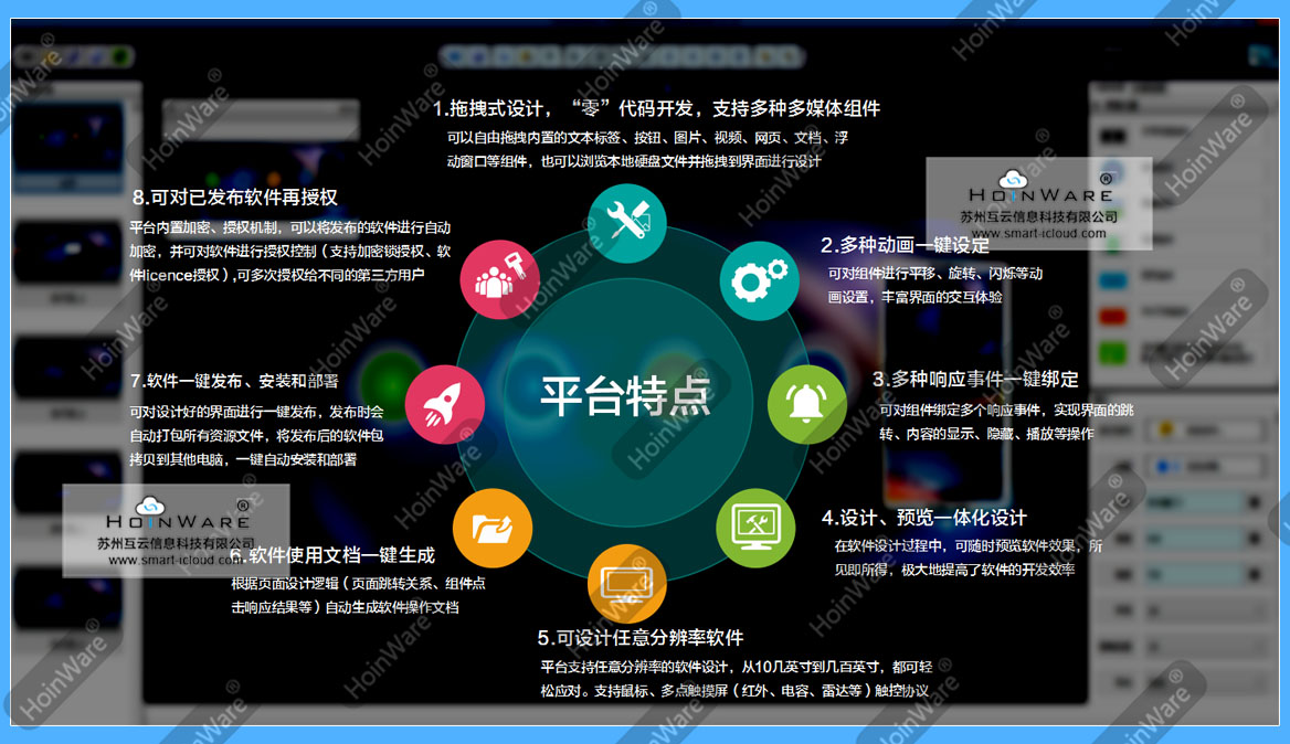 HoinWare®多媒体互动软件开发平台,拖拽式设计、软件一键发布、支持发布后授权、支持多种触控设备、支持任意分辨率的屏幕、一键生成软件操作文档