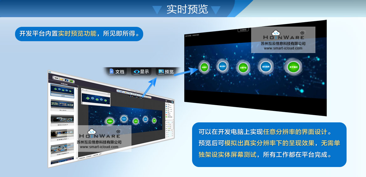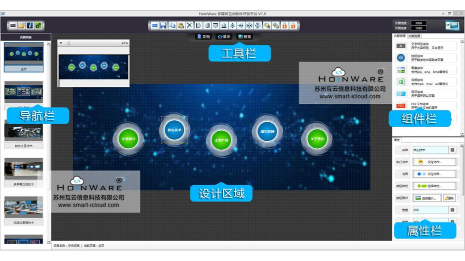 软件采用设计、预览一体化设计,编辑的同时,随时预览软件最终效果。内置了文本、按钮、文档、图片、视频、网页、浮动窗口等