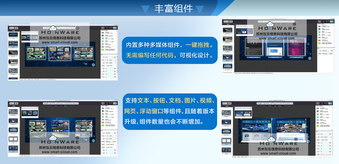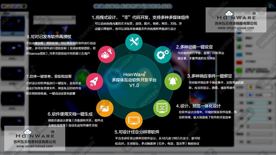 该平台软件将触控互动技术与主流的多媒体内容融为一体,通过简单拖拽、设置即可在几小时内快速开发出12英寸~几百英寸任意
