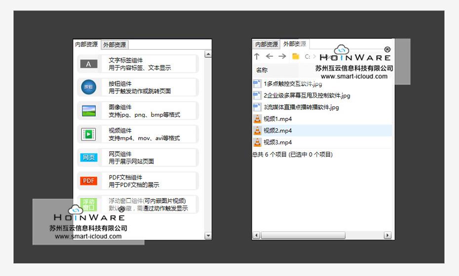多媒体互动展示常用的组件,并可设置组件的动画、执行动作。内部、外部资源一键拖入加载。