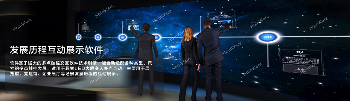 HoinWare发展历程互动展示软件是一款针对大尺寸触控LED大屏/投影大屏研发的专业交互软件。