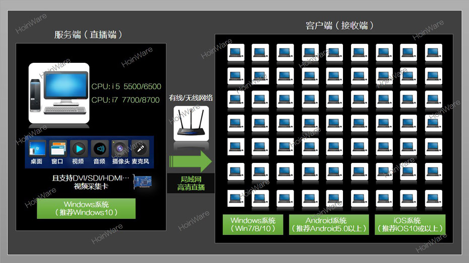 HoinWare流媒体录播&无线直播&VOD视频点播软件适合于会议、教学、信息发布厅等需要同屏直播的场景,