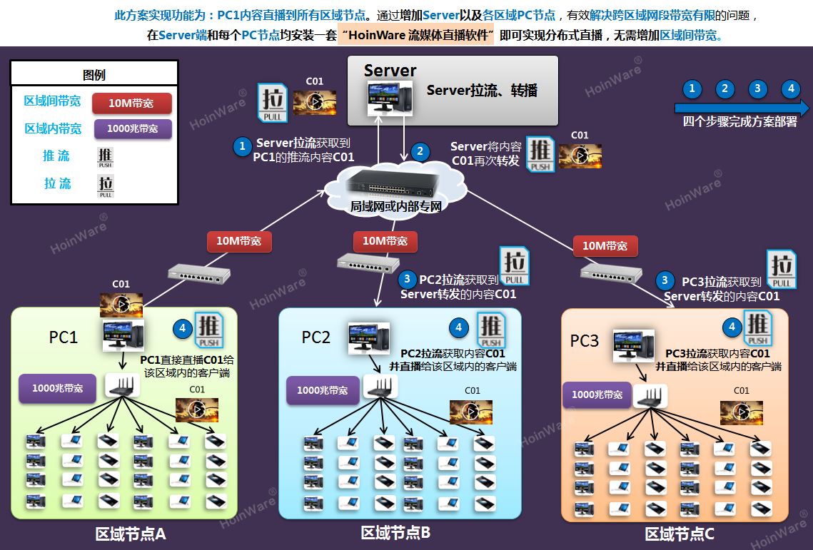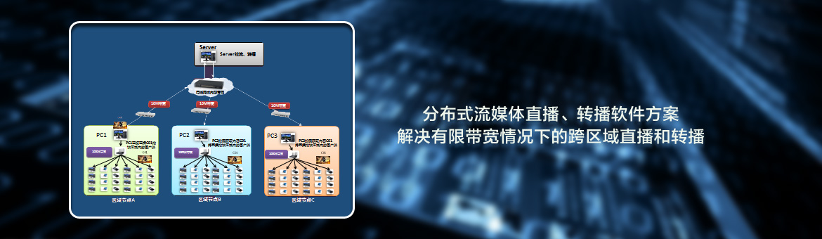 通过多台PC(多个区域节点)并联组网,可以快速搭建数万并发的直播、转播系统。